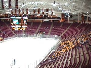 Fourteen years after the new Mariucci Arena first graced the campus of the University of Minnesota, fans and players alike still are amazed by the breathtaking beauty of a sold-out Mariucci and the atmosphere it provides. In 1993, the old Mariucci Arena, located in front of Williams Arena, took on a whole new face when it relocated just north of its old home. The new Mariucci Arena brings a brand new look to Golden Gopher hockey, not only from the outside, but inside as well. With the best sight lines possible from every seat, no Gopher fan is ever disappointed with the view of the fastest game in town. The Olympic-sized (200 feet by 100 feet) ice sheet lends itself to the free-wheeling style of play of Minnesota’s “Pride on Ice.” With the capability to have ice year-round, the arena brings a truly state-of-the-art facility to the University of Minnesota Twin Cities campus.