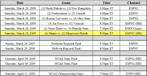 With the Miami bid, the RedHawks will play on Friday at 5:30pm on ESPN2. If they were to win that game and move to the regional finals, they would then play on Saturday at 9:00pm on ESPNU. Both games are available in HD. Below are the TV listings for each tournament game: