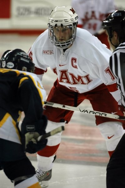 >On the heels of two Miamians being named to the CCHA All-Rookie team, another honor comes along today, as junior forward Brandon Smith was selected as Miami’s scholar athlete. Smith, who carries a grade-point average over 3.70, is now one of twelve finalists for the league award (one player is selected from each CCHA team.) The winner will be announced on March 19, as a part of the 2009 CCHA awards banquet. Congratulations to Brandon. It has certainly been a season of career firsts for the hard working Pepper Pike, Ohio native.