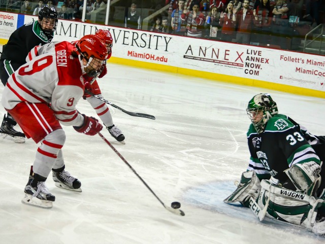 Miami again took a one-goal lead midway through the second period. Kiefer Sherwood carried the puck through the neutral zone behind the North Dakota net before curling and connecting with Green. Green’s initial shot was blocked, but the rebound came back to Green, who stuffed it in the short side.