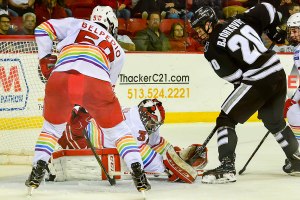 Right after the Friars’ third goal, the RedHawks’ Kiefer Sherwood went in alone and appeared to have tucked the puck under goalie Hayden Hawkey.