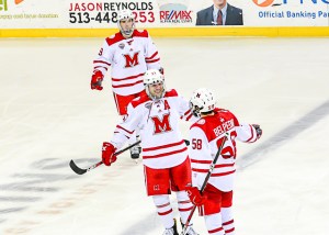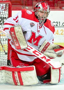 MU goalie Ryan Larkin was lifted after allowing six goals, and backup Chase Munroe was actually credited with the loss for giving up the final four, even though Miami never tied the score.