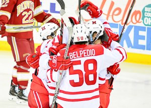 The RedHawks (9-10-2) cut it to one on a blue-line blast by Louie Belpedio and a freshman-to-freshman connection of Phil Knies to Ben Lown.