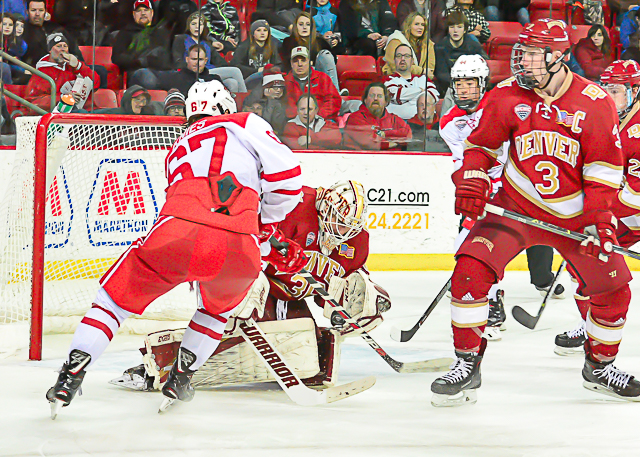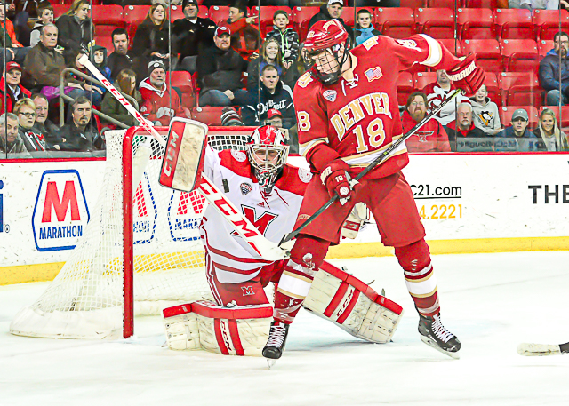No. 5 Denver scored the first three goals in a 4-1 win over the RedHawks at Cady Arena on Saturday, as the teams split their weekend series.