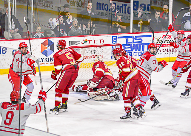 The RedHawks (9-10-2) cut it to one on a blue-line blast by Louie Belpedio and a freshman-to-freshman connection of Phil Knies to Ben Lown.