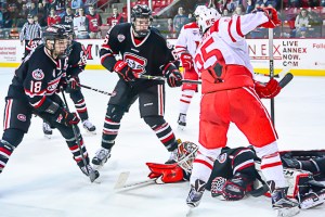 The RedHawks (11-17-3) cut the deficit to one when Phil Knies took a feed from Kiefer Sherwood wrapped around the back of the net and tucked it past goalie Cam Johnson 1:42 into the third period.