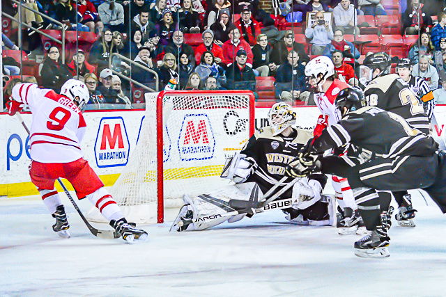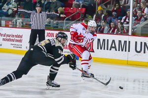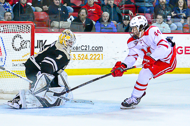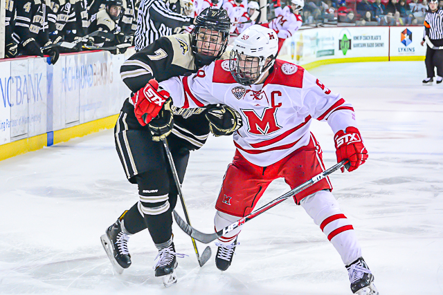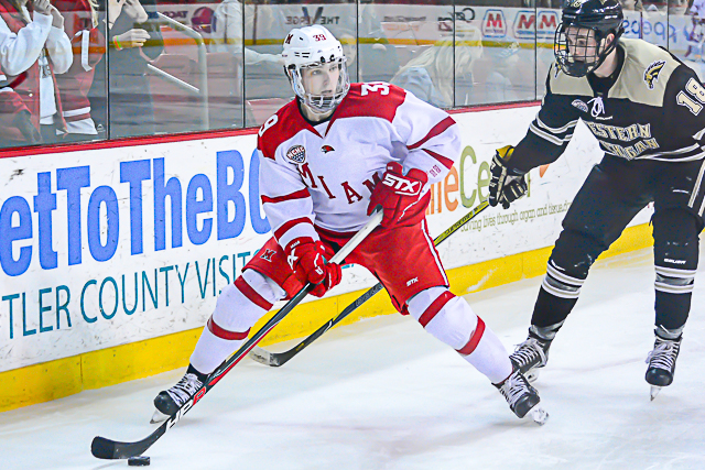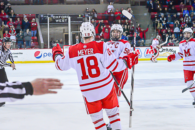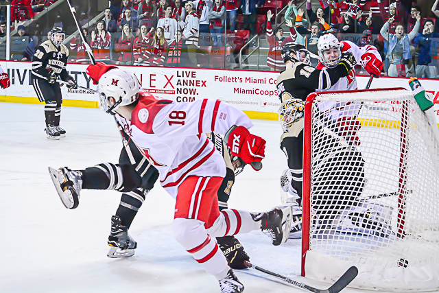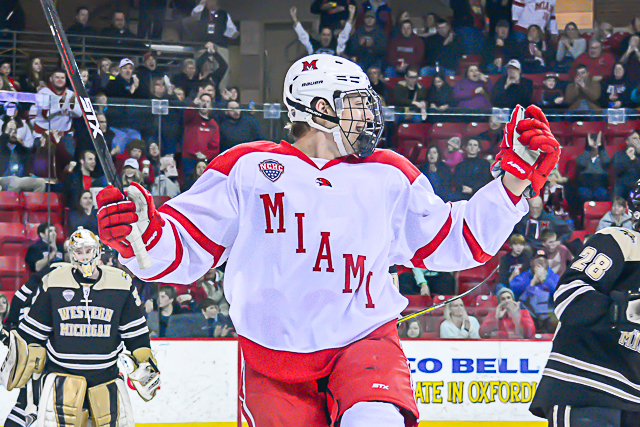 – Game 18: Like this weekend, Miami had beaten Western Michigan in the opener in Kalamazoo. But in the finale, the RedHawks blew a 3-1 lead as Wade Allison recorded a natural hat trick, cutting the deficit to one midway through the second period, tying it with 4:02 left in regulation and winning it in overtime.