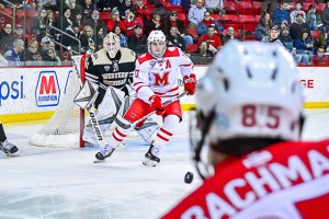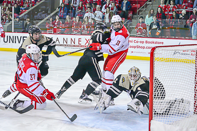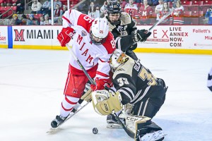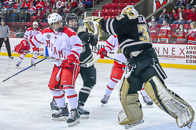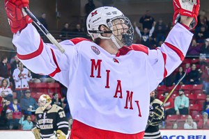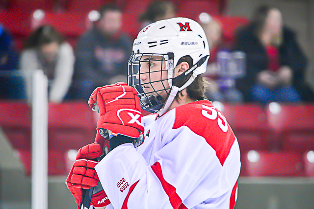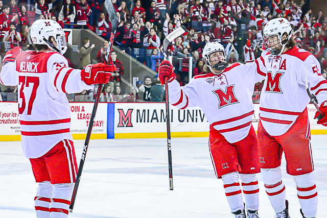 But Miami answered with a two-man advantage of its own when Grant Hutton wired a shot through from the top of the faceoff circle off a feed by Alec Mahalak with less than four minutes remaining in the middle frame, making it 3-1.