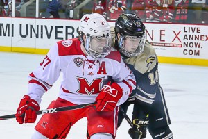 Western Michigan’s Corey Schueneman beat Miami goalie Ryan Larkin high on the glove side for a 5-on-3 goal with 10:18 left in the second period.