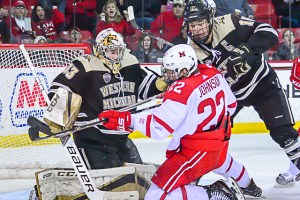 Western Michigan tied it with exactly four minutes left in that frame on another Frank goal. Frank was a trailer on a 2-on-2, and he took a pass in the high slot from Dawson DiPietro and buried it.