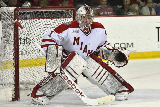 Lukas Hafner will likely be a little less relaxed this weekend with Miami firing nearly 38 shots per game – second in the nation. (Photo by Tom Turrill/MiHockey)