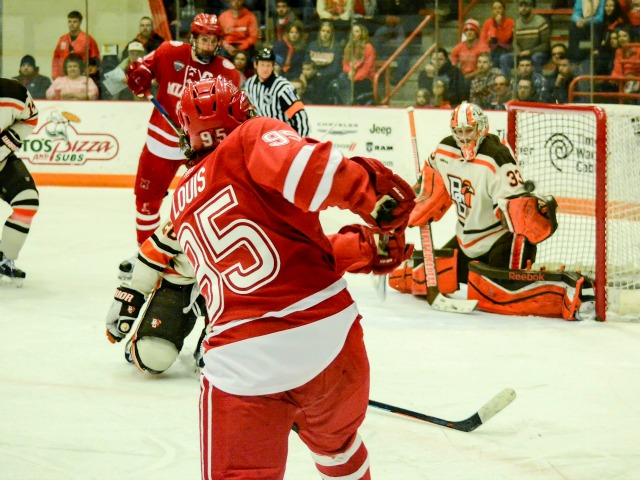 The decisive play started with Matt Joyaux knocking down a SCSU shot in front of his net and skating to center, where he fed streaking Anthony Louis on the right wing. Louis crossed the blue line, curled and slid a pass to Greenberg, who was open in the slot.