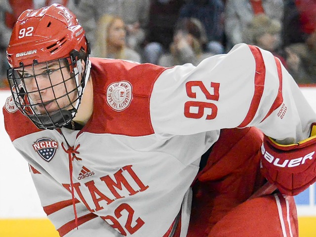 Miami pulled even at the 3:28 mark of the second period when Grant Hutton’s shot from the blue line was stopped by Tanner Jaillet, but the goaltender allowed a huge rebound that Willie Knierim batted in for his first collegiate goal.
