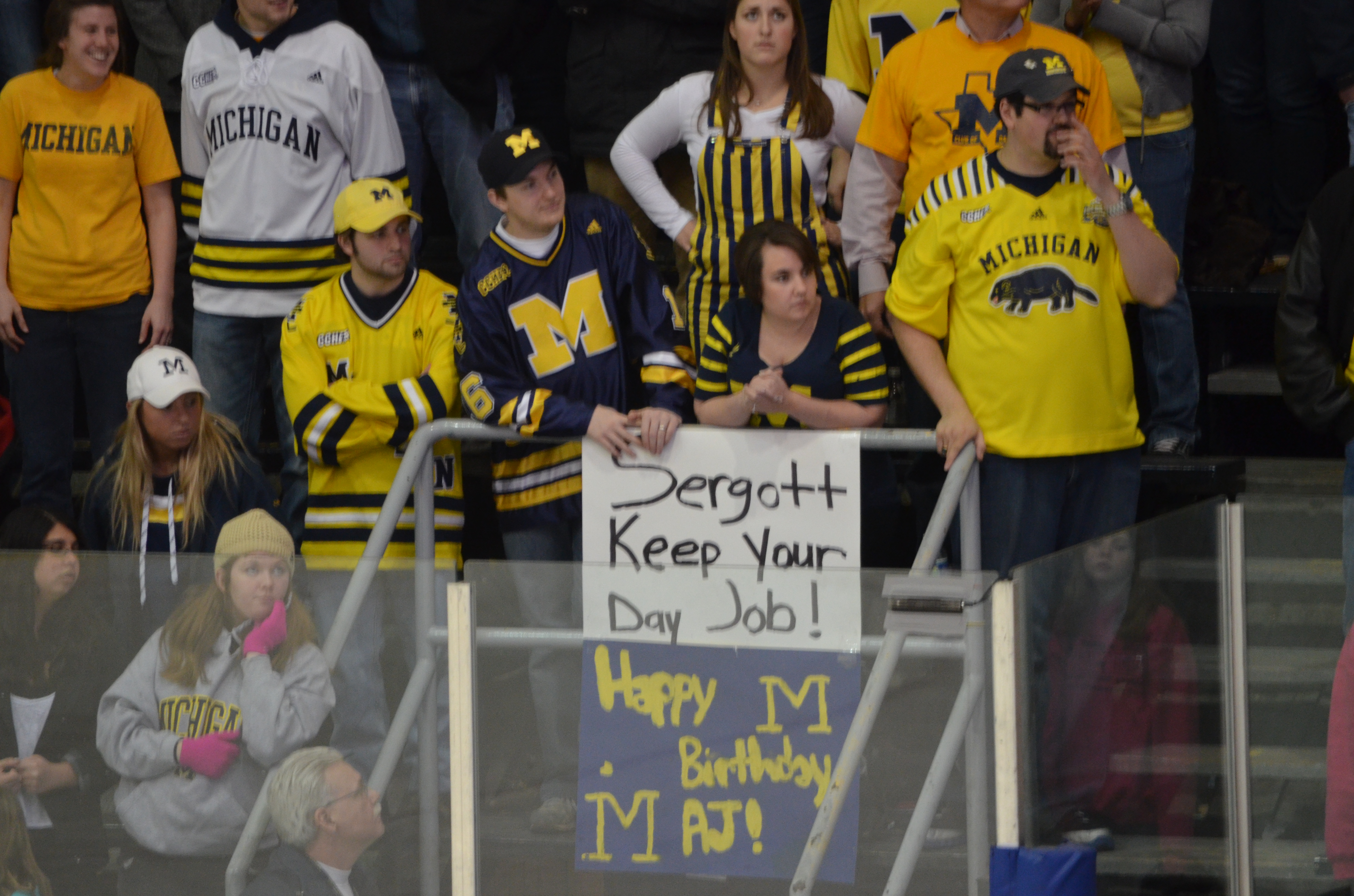 I’ve uploaded several pictures for your perusal. Head over to our Facebook page for the full album. Don’t miss the end of the album to enjoy the “many faces of Rico Blasi” portion. Coach Blasi was bummed out absolutely incensed with the officials in the third period of Saturdays game after a weekend of inconsistency and unbelievable calls. The following pretty much sums it up. Thanks to these fashionable crazily dressed Wolverine fans for the picture opportunity: