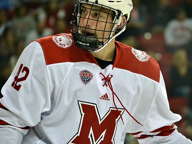 With two minutes left in the opening stanza, MU defenseman Grant Hutton carried the puck the length of the ice and temporarily lost it before regaining possession and sliding it through the top of the crease to a wide-open Green for a one-timer to make it 2-0.