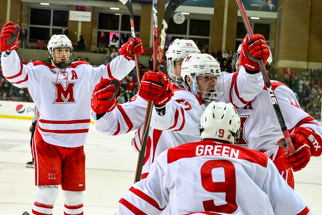Miami actually led, 2-0 in this game. Gordie Green put the RedHawks ahead when he took a feed from Josh Melnick, turned and fired it in from the high slot with 3:53 left in the first period.