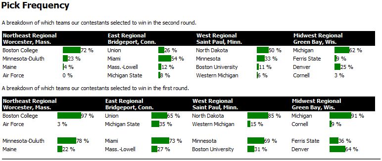 Secondly, jump over to the CHN Bracket Contest and submit your picks. You saw my picks last night/this morning, and they match up there. Whomever wins the bracket contest from our readers gets the best prize ever.